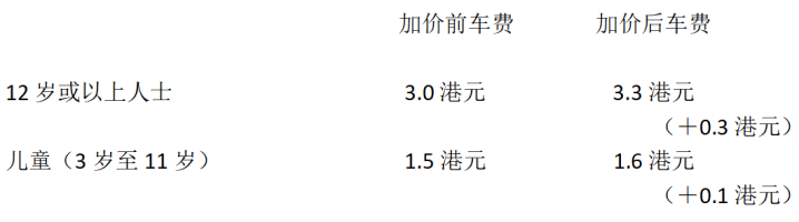 此外,65岁或以上的老人票价,也会由目前1.3港元调高至1.5港元,而现时票价为260港元的月票,则维持不变。